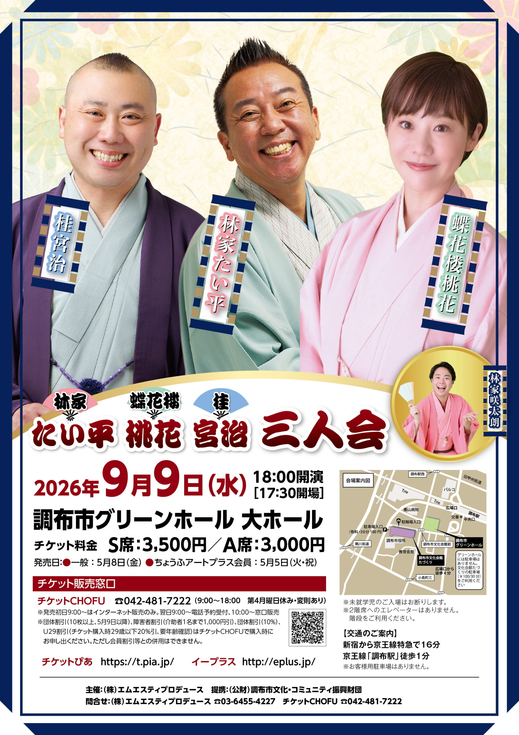 テレビで人気の「林家たい平」「桂宮治」と人気若手女性落語家「蝶花楼桃花」の落語会を是非、お楽しみください。