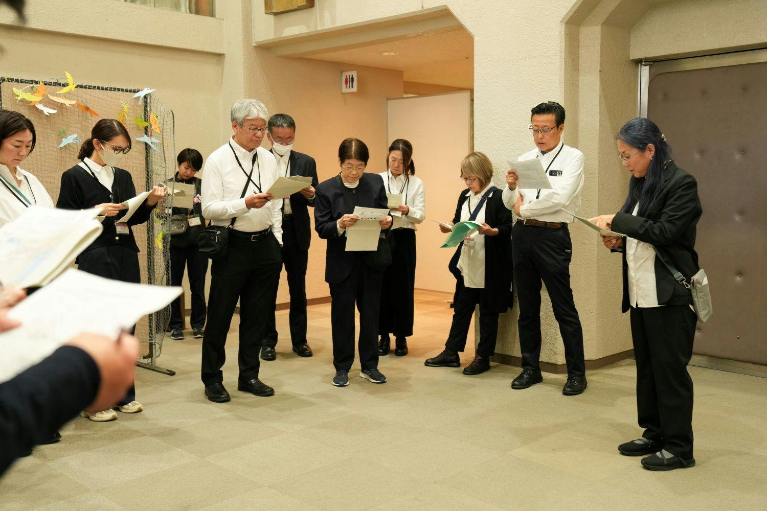 梅雨空の中、深大寺本堂には125名ものお客様にご来場いただき、私たちは「チームCIMF」としてお迎えしました。2公演のうち、私は第1回目に参加し、その回では10名のボランティアスタッフが活動しました。職員の方々によるご丁寧な打ち合わせのもと、私は、3名の場外入場列整理担当の一員として動きました。