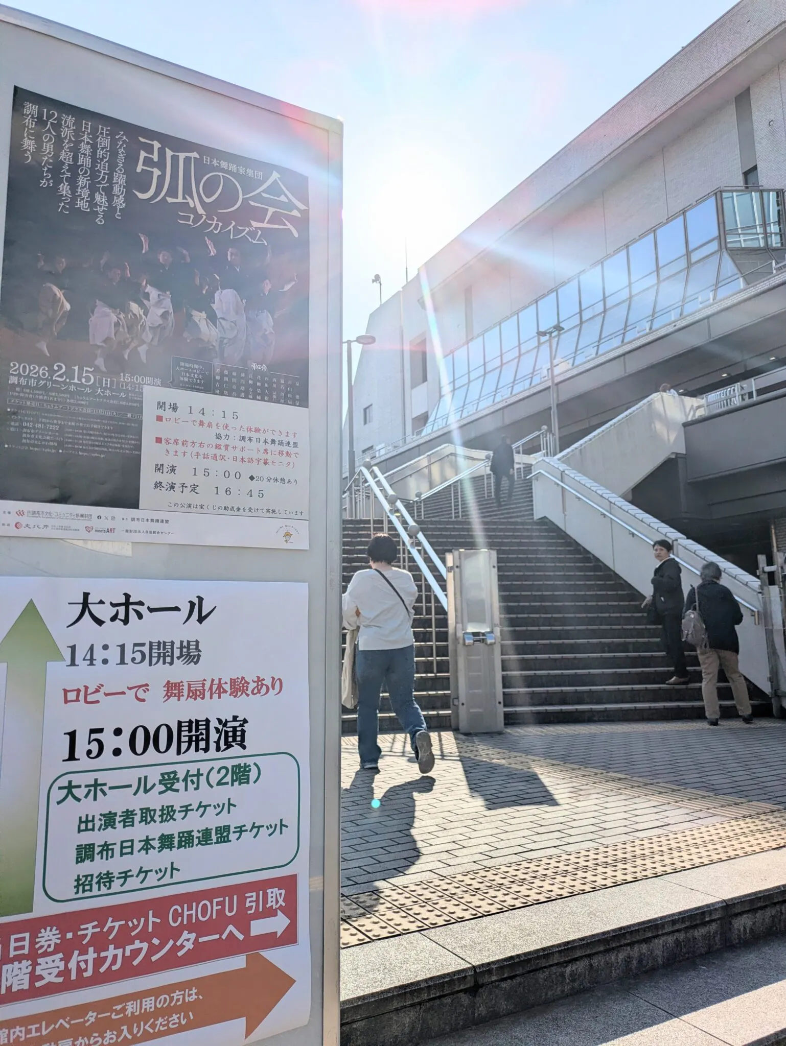 エレベーターが来るのを待ってる間、お客様が「自分も舞踊を習っている」とか「久しぶりにいいお天気で嬉しい」とか、色々と話しかけてくださるので、時間はあっという間にすぎて、開演前に2階に上がった時には喉がカラカラになっていました。