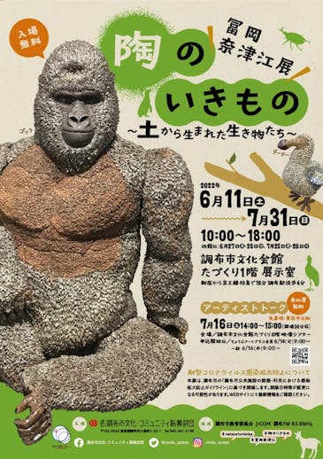 冨岡奈津江さんは粘土を使っていきものを制作し、動物の存在や温もり、そして溢れる生命感を表現し、高い注目を集めています。本展では、等身大のゴリラをはじめ、ペンギン、ドードー鳥、巨大カブトムシなど身近な生き物からびっくりするような生き物まで、約30点を展示します。