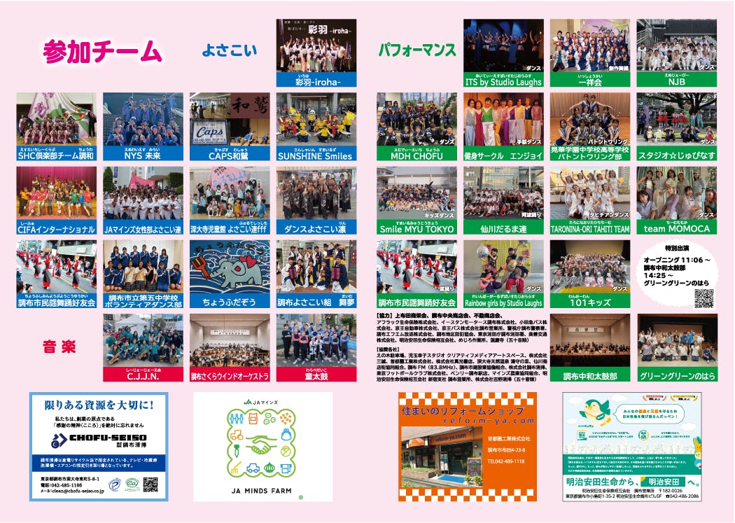 今年はよさこいに加えて、キッズダンス、タヒチアンダンス、阿波踊り、吹奏楽などの出演があります。お楽しみに!