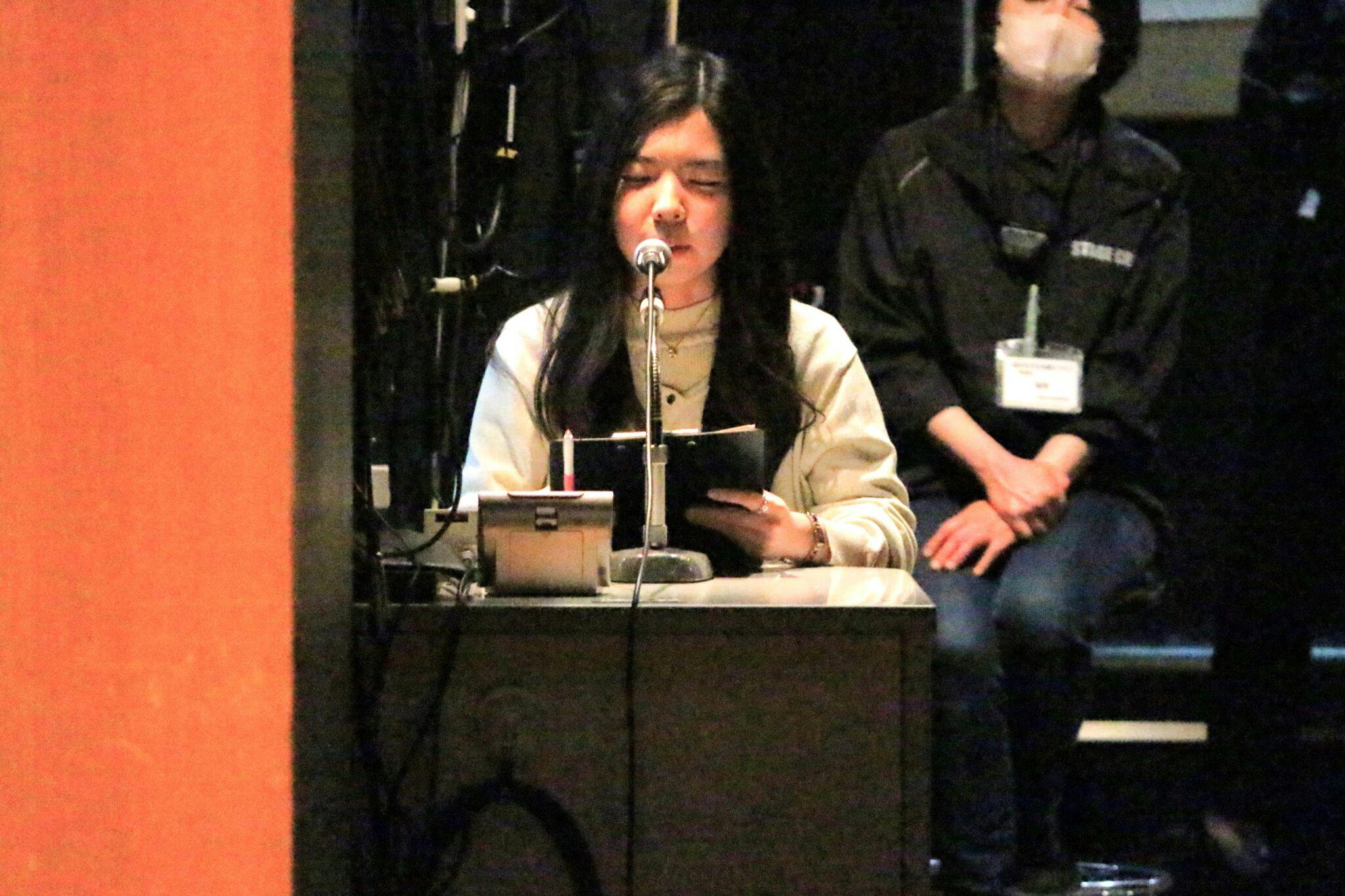夏休みこども向けミニシアター「シンドバッドの冒険~調布一夜ものがたり~」にて、マイクを使わず地声で、お客様の前に出て舞台上で開演前のアナウンスをしたことは印象に残っています。事前にアナウンス原稿をもらえたので、家で何度も練習しました。小さなお子さん達やそのご家族の前で長いアナウンスをしましたが、地声の発声の難しさを感じ、役者の方々の発声は凄いものだと思いました。終演後、座席クッションをお子さんやお父さんお母さんから回収する際、さっきのアナウンスの人だ、と覚えてもらえて「ありがとうございました」と声をかけていただき、とても嬉しかったです。優秀映画「大映傑作選」「雨月物語」でも本編終了後の影アナを担当し、グリーンホールでの影アナということで緊張しましたが、とても良い体験だったと思っています。